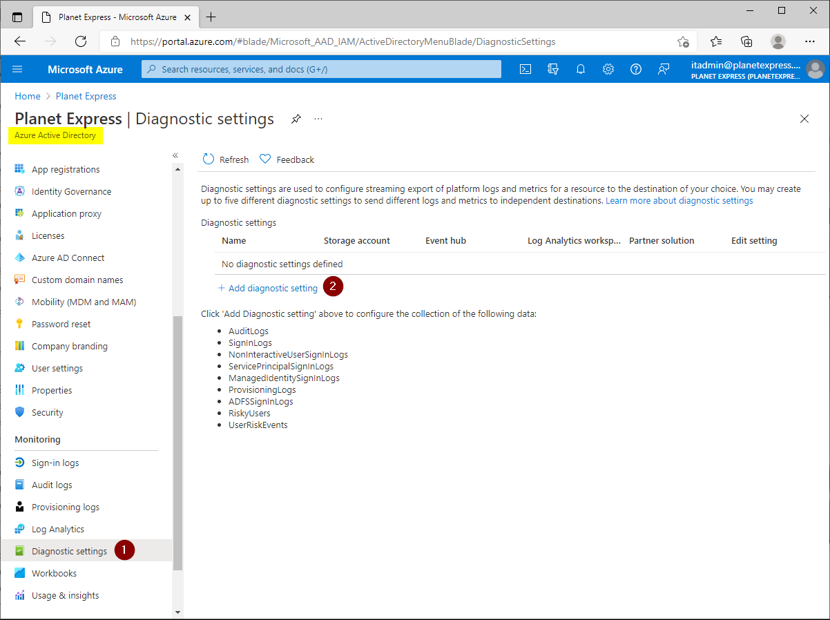 Azure Active Directory - Diagnostic Settings - Add diagnostic setting