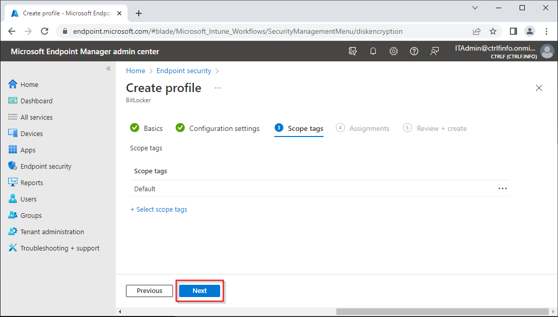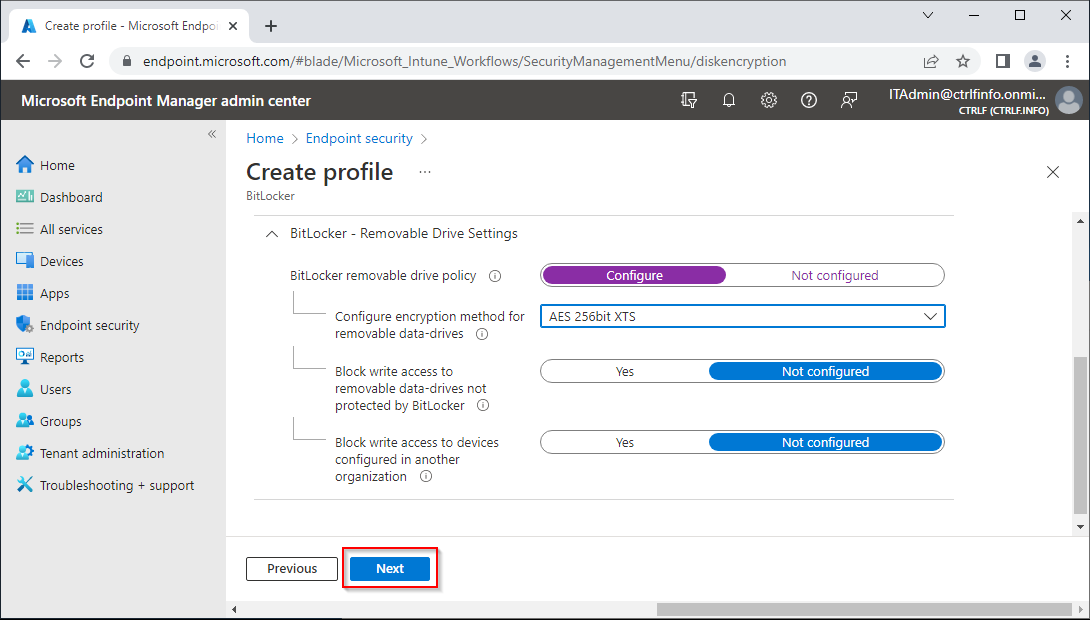 Endpoint Security - Disk Encryption - Select BitLocker policy