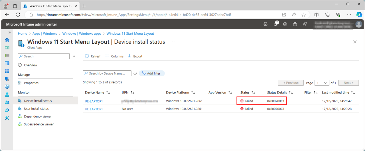 Intune Windows App PowerShell script install fails with error 0x800700C1