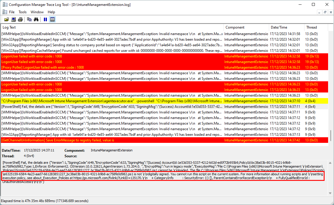 The IntuneManagementExtension.log shows the error message for the failed PowerShell script: